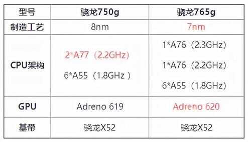 在制造工艺上,骁龙750G使用的是8nm工艺,而骁龙765G使用的是更新的7nm工艺。 CPU架构上骁龙750G是2颗A77核心,而骁龙765G是两颗A76核心,骁龙750G性能上要强于骁龙765G。GPU上骁龙765G的Adreno 620比750G的Adreno 619更加领先,打游戏会更好一些。