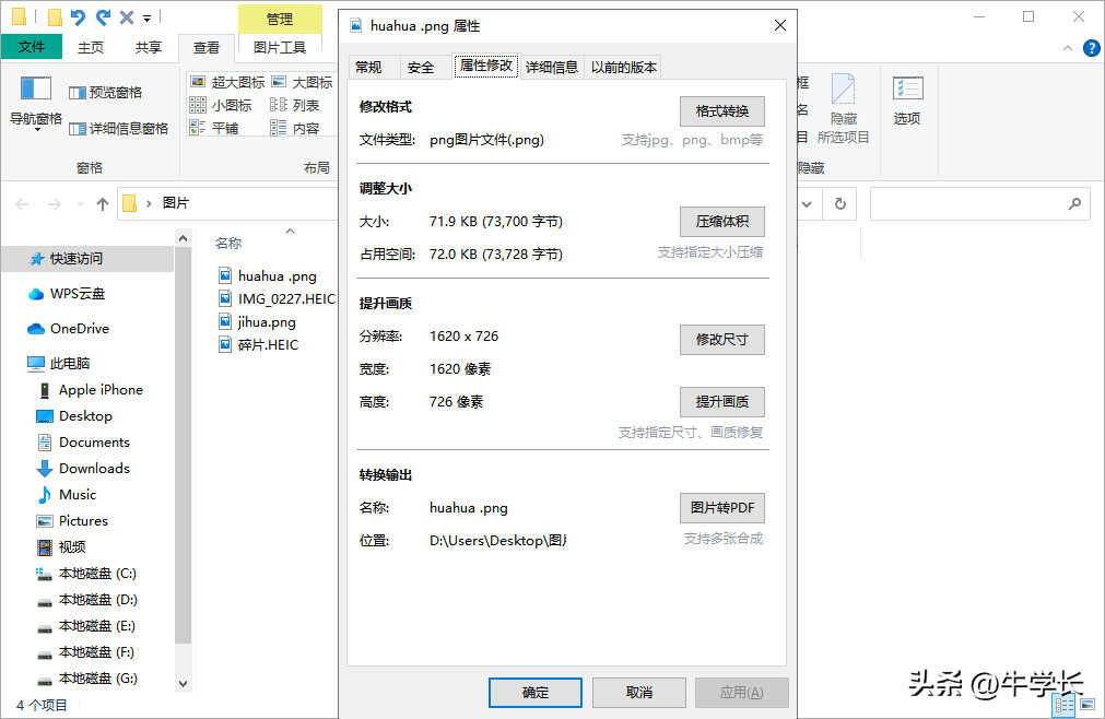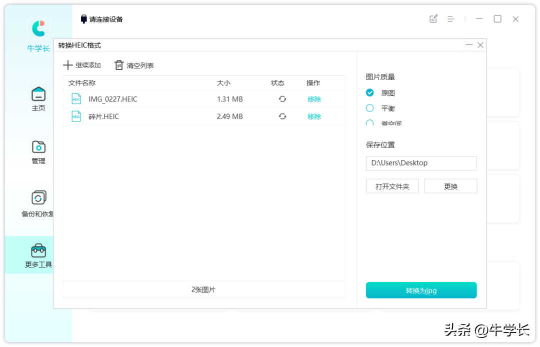 HEIC格式照片是无法通过改后缀、属性栏进行格式转换的。可使用牛学长苹果数据管理工具,一键批量转换图片格式。