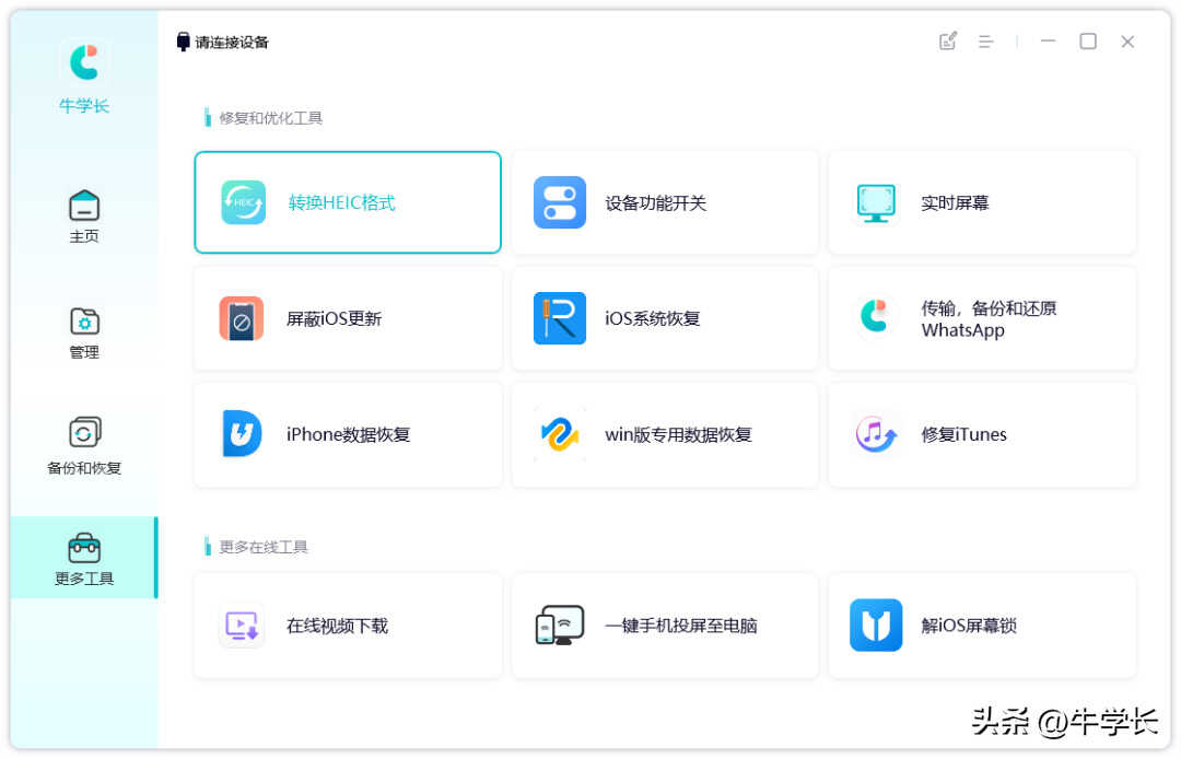 第1步:安装启动牛学长工具,直接选择软件界面的“更多工具”功能区,再选择“转换HEIC格式”,然后就可以选择添加想要转换的HEIC格式图片。(工具可在评论区获取)