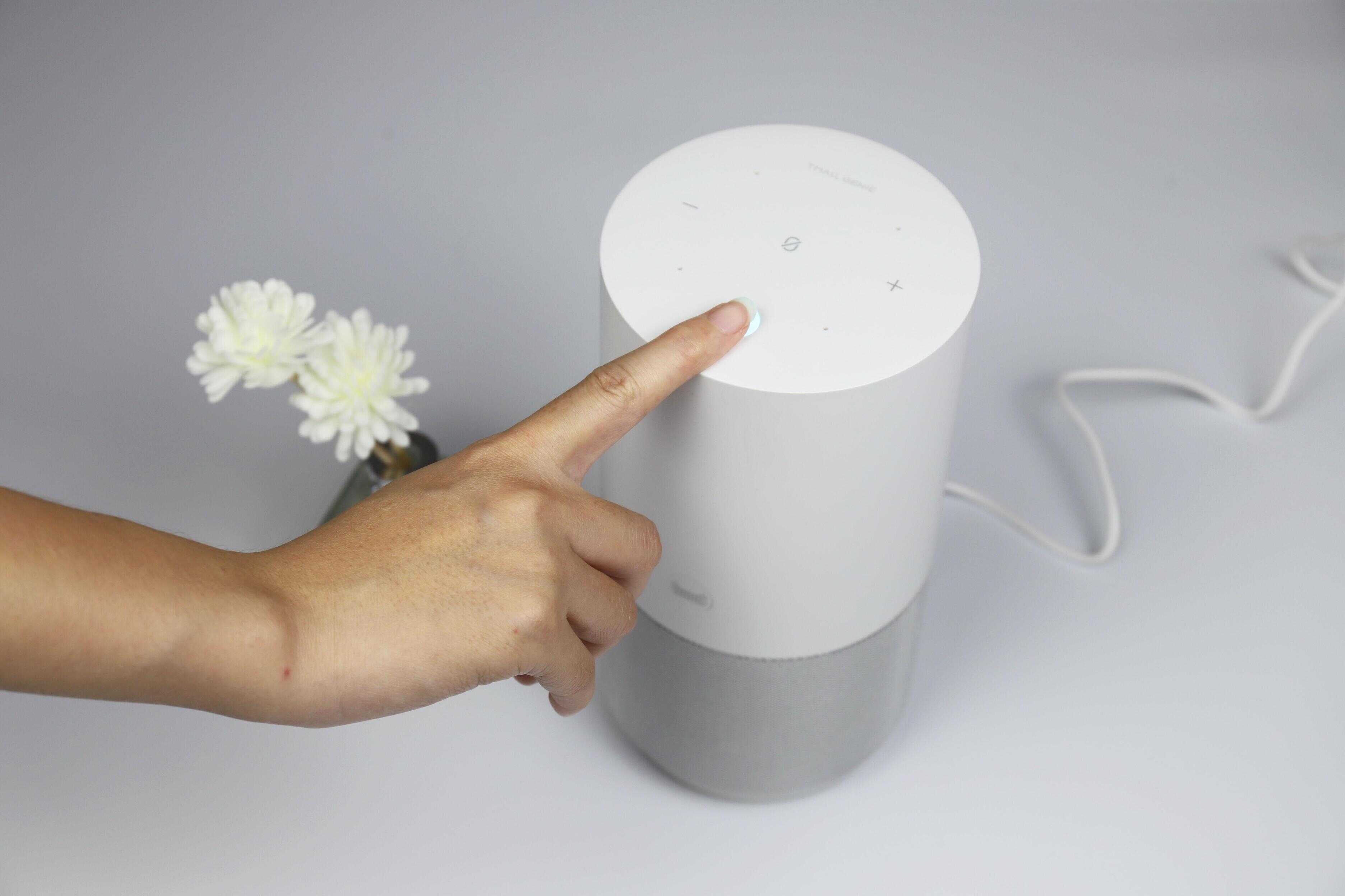 当然,简约的设计并不意味着功能的缺失,天猫精灵X5在顶部集成了一颗“精灵键”,它将状态灯与触控键合二为一,具备了消息提示、闭麦提示、对话闪动等功能。
