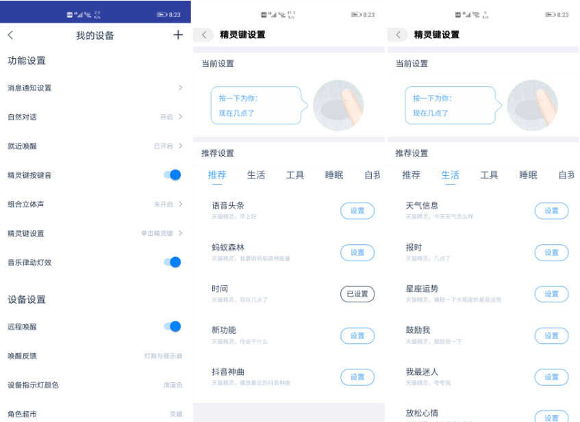 不仅如此,天猫精灵X5的这颗按键还可以自定义设置功能,譬如一键帮你播报语音头条、或者是查询天气信息、报时等,甚至还可以实现一键控制家中其他联网的智能硬件以及一键通话,让操作变得更简单快捷。当你完成了相关设置之后,对于家里的老人与孩子来说,就不用再花时间去学习操作了。