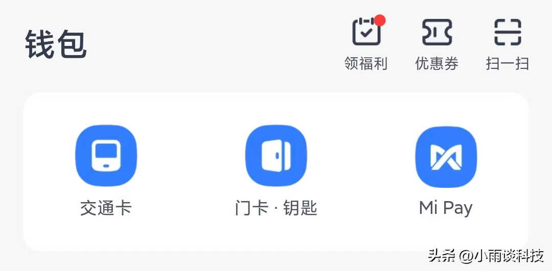 接下来打开手机系统自带的【小米钱包】开始利用NFC功能复制门禁卡。可以看到,在小米钱包的首页顶部有【交通卡】、【门卡.钥匙】和【Mi Pay】三个选项,其中的【门卡.钥匙】就是接下来操作的主角。