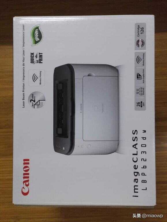 打印机真身出现,简约的设计佳能LOGO、系列、型号及基本功能介绍如:每分钟26页;支持有线网线连接;支持双面打印;支持无线网络连接。