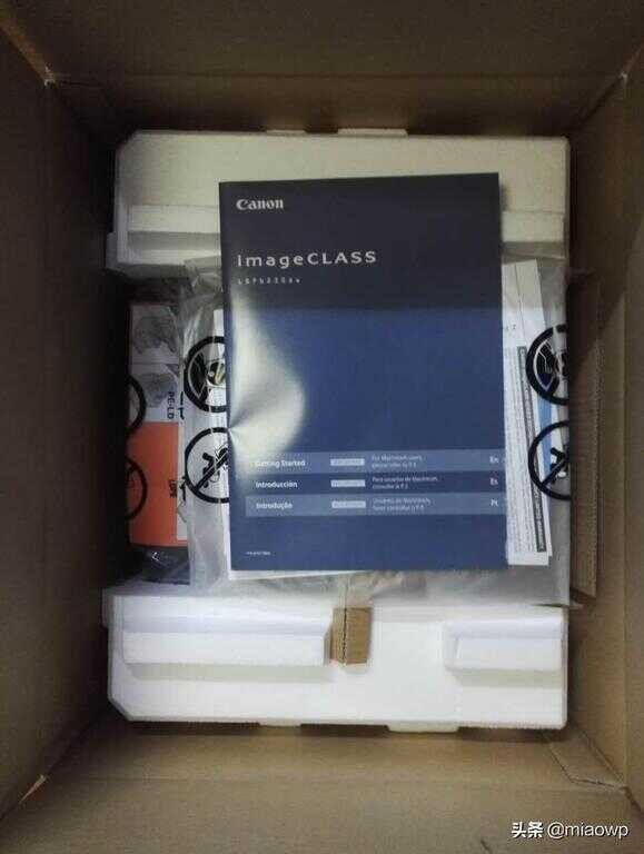 打开打印机包装,一入眼帘蓝色的是简易说明书,就快要露出打印机真身了。。。。。。