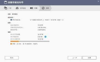 完成存储池创立后,还需要为RAID设置卷的类型,不同卷在空间使用,性能表现方面存在一些差异,我们可以按需设定,如果没有突出需求,直接点击默认的“厚卷”点击创立,进入配置页面选择磁盘区卷容量等客制化设置后,点击完成即可实现所有存储池的建立。