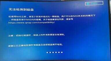 首先是产品激活部分,我们将产品链接至显示器设备,基于该产品支持热插拔服务,因而我们可以暂时不安装希捷酷狼Pro硬盘,空盘启动后,进入系统提示“无法检测到磁盘”后,此时可以将希捷酷狼Pro硬盘放入NAS设备,经过短暂的安装、兼容性校准以及初始化后,NAS设备开始进入智能安装向导。