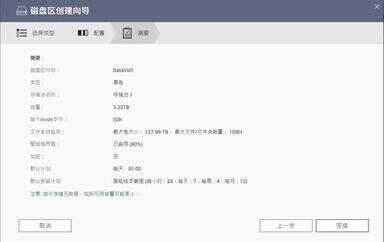 简单确认后,可以情况设置诸如警报临界值、快照空间等比例设置后,点击创建,几分钟后存储池即可完成创立。