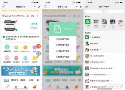 相较于HP Smart App打印,使用惠普云打印微信小程序打印更为方便,点击惠普云打印小程序页面的“文档打印”,会跳出一个新的窗口,可以选择在“聊天记录、百度网盘、天翼云盘和本地存储”中选择文档打印。