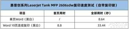 复印方面,使用惠普创系列2606sdw打印机控制面板上的复印功能,全部为默认设置,实测复印速度为21.9页/分钟。