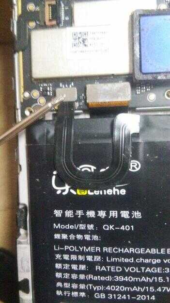 7、屏蔽盖取出后找出电池软板与主机卡扣盖。图中螺丝刀指示位。用指甲或摄子轻轻抠出来。