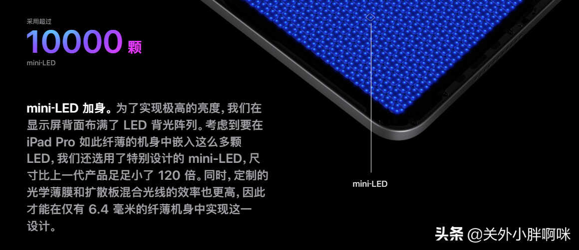 但仔细看完你会发现iPad上是在Pro版本才用上了MiniLED,这是为何呢?随着苹果的M1芯片强大的能力展现,iPad Pro已经逐渐变成生产力工具了,不是单纯拿来刷剧、看文档简单使用,为了满足这些设计师们的镭射激光眼,他们对色彩还原、对比度的要求、长期使用的稳定性、续航(小声点:MiniLED比OLED 省电可达80%),不难理解苹果会使用MiniLED的原因了。