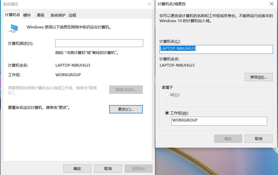 右键点击“此电脑”选择属性,接着点击窗口右侧的“重命名这台电脑”,点击“更改”,将局域网内所有计算机都设置在一个工作组。