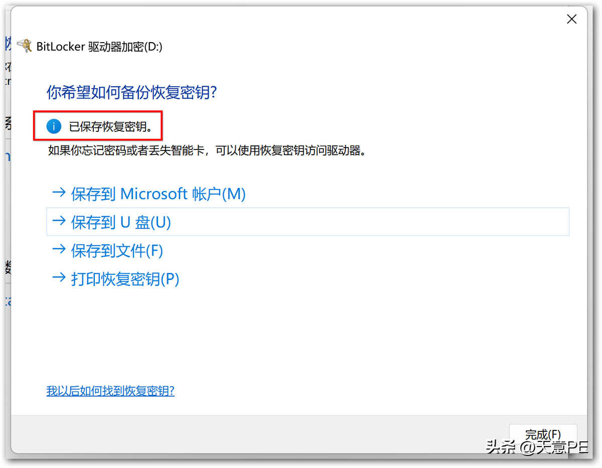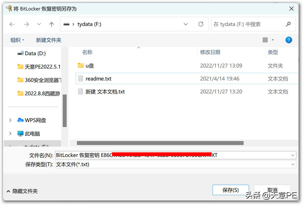 但是这样虽然方便了,安全性却得不到保障。所以最好的办法还是我们把BitLocker密钥保存到U盘。下次启动的时候直接复制密钥或从U盘加载密钥来解锁磁盘。