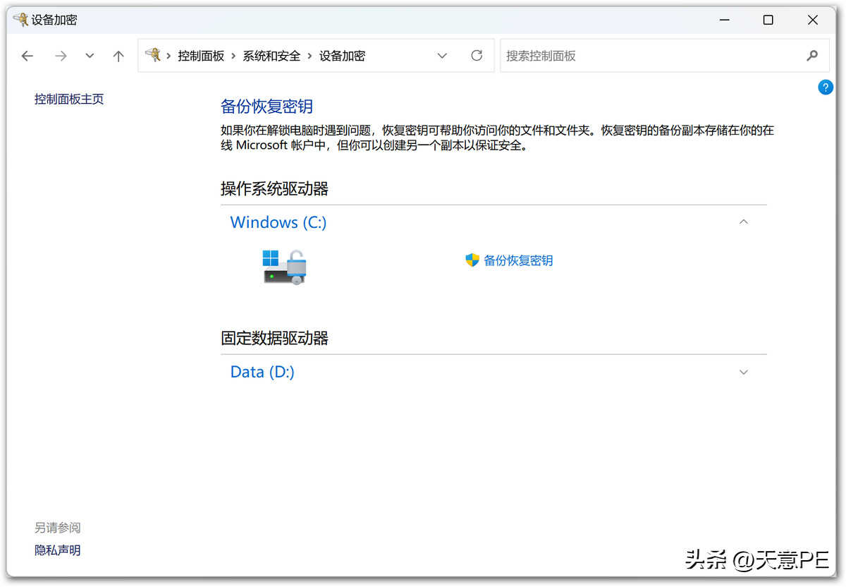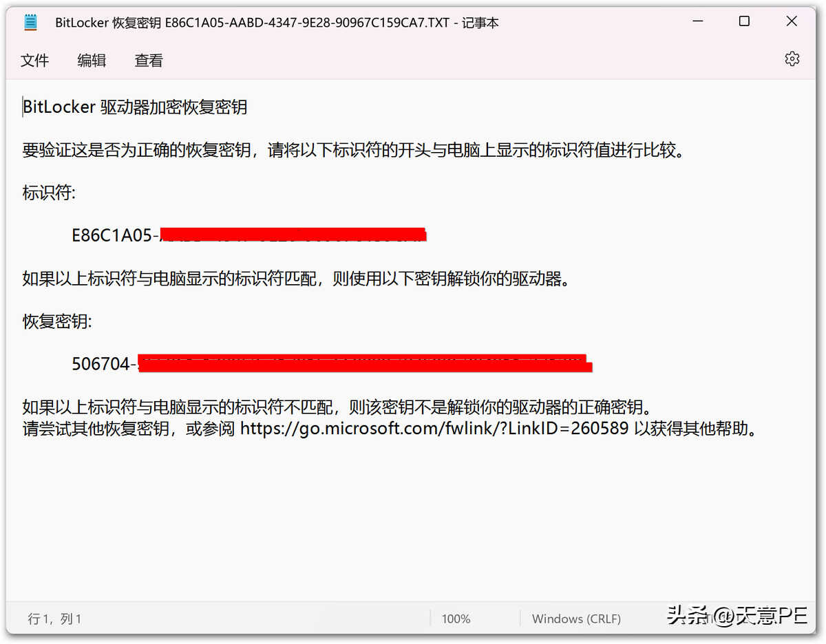 可以看到标识符和恢复密钥都在文本里。我们用WinPE维护电脑的时候可以通过密钥解锁硬盘了。