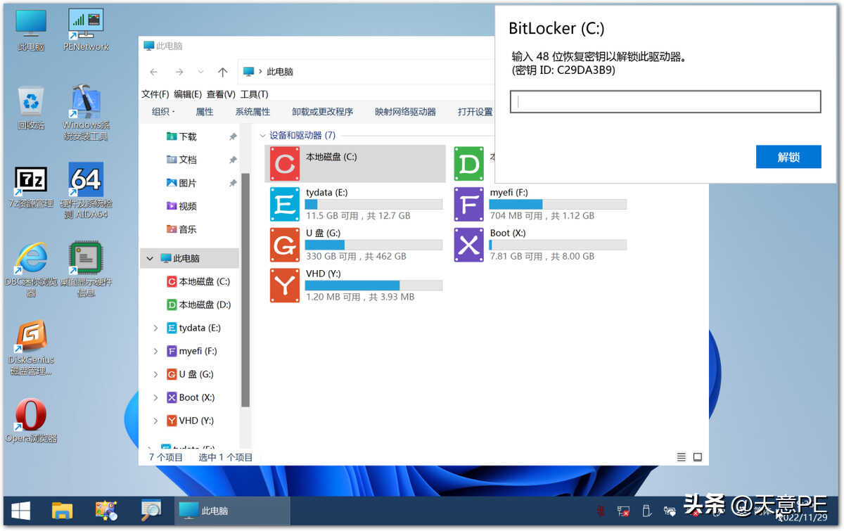 BitLocker加密保护了数据的安全。但是也带来了一个小问题,就是当我们用WinPE维护电脑的时候稍有不方便。每次打开磁盘都需要输入恢复密钥,一大堆数字,稍不注意输错了还得重新再来。