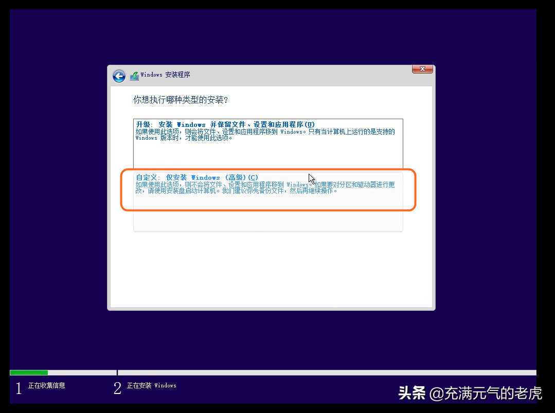 第十一步:执行哪种类型的安装,选择自定义 仅安装Windows(高级)