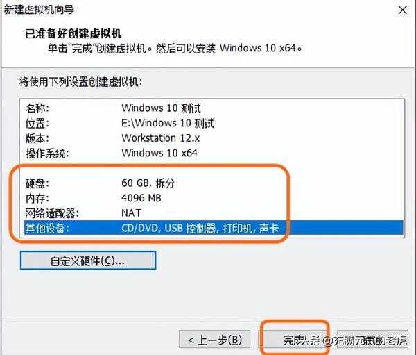 第六步:系统默认设置的虚拟机配置(如想自己设置,可通过自定义硬件选择设置)