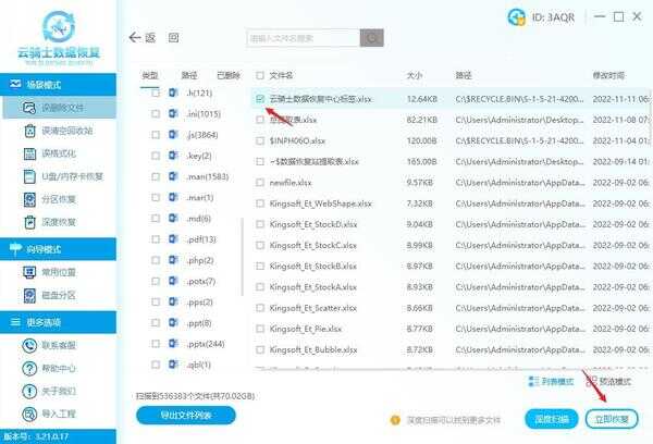 4.找到所需文件后进行勾选,点击下方的“立即恢复”按钮,将文件保存到其他磁盘即可完成误删文件恢复操作。