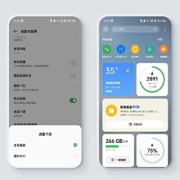 全局搜索有两种呼出形式,一种是在桌面设置中设为桌面下划进入,另一种是在负一屏顶部进入。