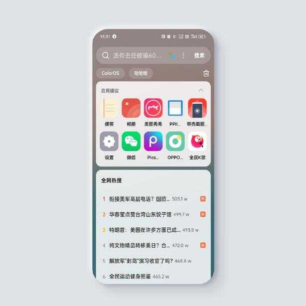 全局搜索的主页主要由4个部分组成,顶部的搜索栏、下方的搜索历史、应用建议和全网热搜。