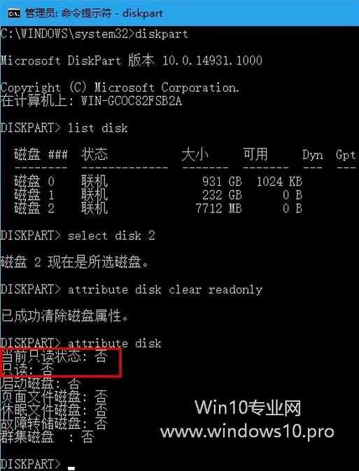 attributes disk命令查看一下磁盘属性看“写保护(只读属性)”是否已经被清除。如上图中“只读状态”显示为“否”即说明“写保护”已被成功去除。