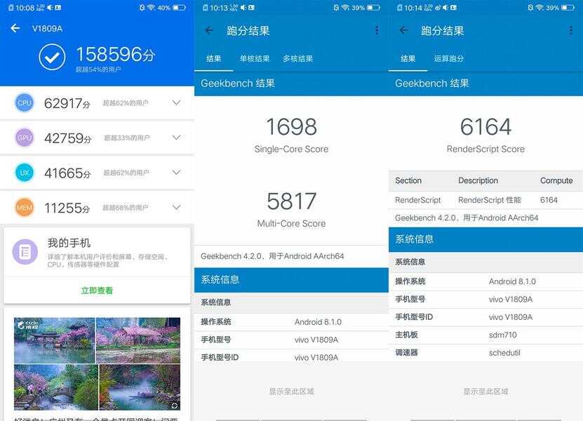 跑分方面,vivo X23的安兔兔成绩为158596分,GeekBench 4单核成绩为1698分,多核成绩为5817分,运算分数为6164分。