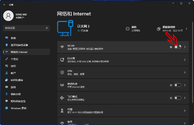 3、接着参照上面的步骤进入系统设置,点击网络和internet,开启WLAN旁边的开关,打开无线网络连接。