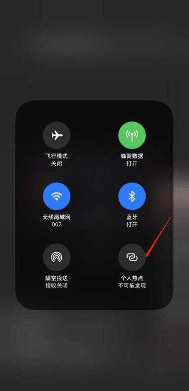 2:设置个人热点为可发现状态,进入控制中心,点击蓝牙键屏幕三秒即可进入设置中心,再开启热点,如图