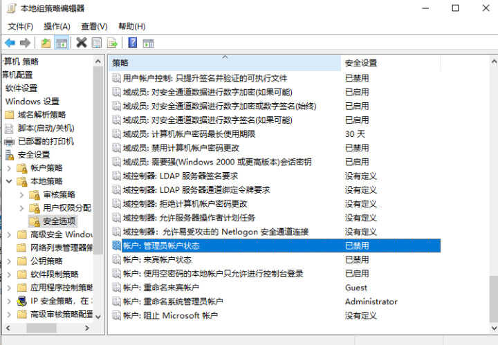 6、最后我们在右侧找到管理员账户状态,把它设置成如下图已禁用的状态即可。