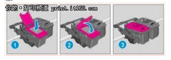 墨盒的正确安装方法: 握住墨盒两侧,喷嘴朝向打印机,然后把墨盒向前滑入插槽。之后,关闭墨盒插槽上的顶盖,确保墨盒安装到位。