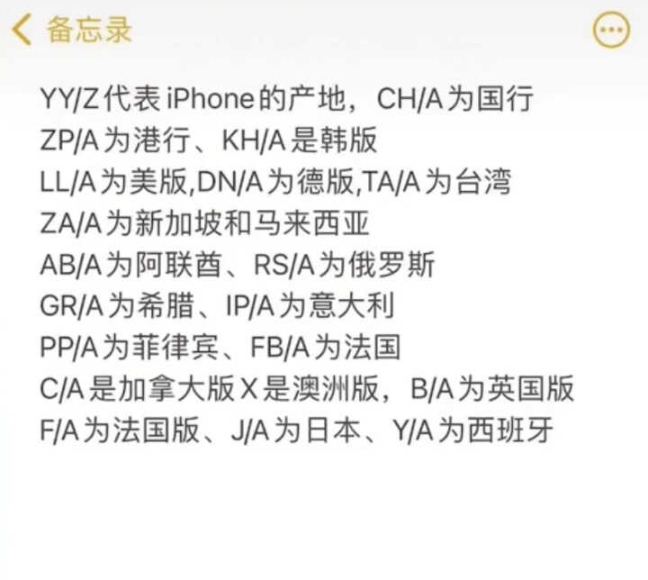二、而斜杠左边字母代表手机的销售地,详细的可以看下方的图片。常见的版本我给大家做出了介绍。CH国行,ZP港版,TA台湾、LL美版,J这是小日本,其他的按照下方图片对比。