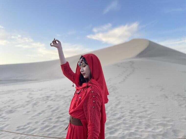 每次拍照之后会发现照片有一个短暂的从模糊到清晰的过程,这个过程就是苹果的深度融合技术在发挥作用,它能够显著改善照片中的纹理和细节,同时智能HDR3技术会利用机器学习技术来不断学习拍摄场景,并对照片各部分进行特定调整,比如这张人物照片,以人像模式拍摄,背景的蓝天没有因为聚焦于人物而泛白,任务主体突出在黄沙和蓝天的映衬下红色的服饰格外鲜明。