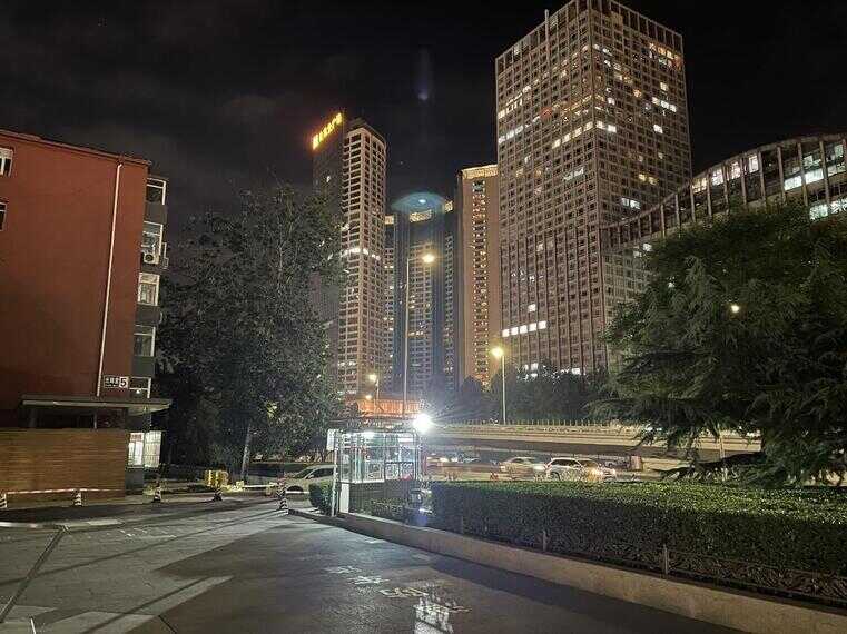 在光线更加复杂的情况下,我们看到iPhone12的拍摄很好的抑制了镜头炫光,正面明亮的灯光只是一个光点,远处楼宇的细节都能清晰辨认,楼顶的广告灯牌曝光准确,能够分辨出具体字迹,表现十分令人满意。不过益达也建议大家在夜拍过程中尽量戴上保护壳,可以极大减少后玻璃背板反射光线对镜头的干扰,能够得到效果更好的影像。