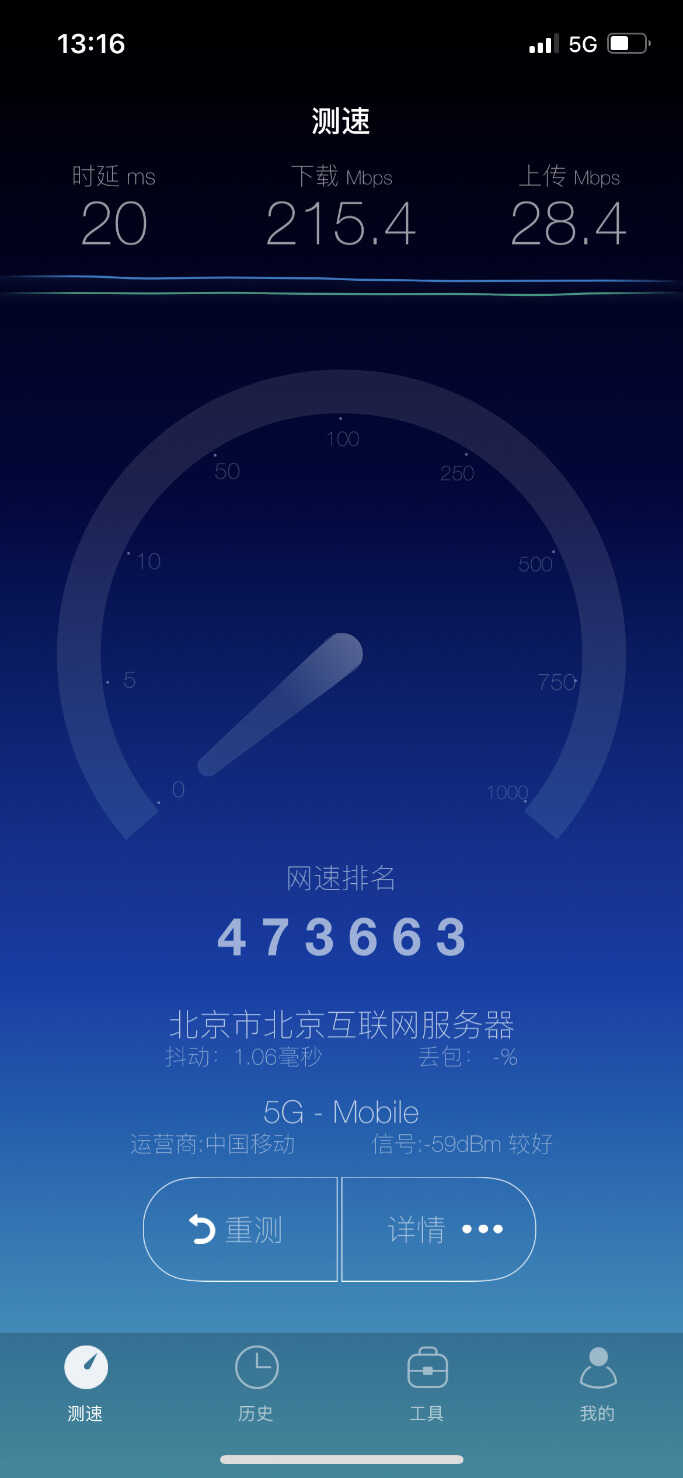 很遗憾,在民用领域目前还没有典型的5G应用场景,尽管北京主城区已经实现了连续益达进行了简单的网速测试,应用更新基本上在秒级内完成,下载速率达到了215Mbps,上传达到了28Mbps,虽然达不到宣称的GB级下载速率,但是在实际使用场景下,这已经是达到了真实的5G网速体验。