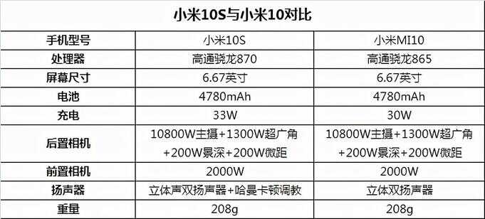从表上我们可以看出,小米10S的和小米10的差别其实并不大,一样屏幕,一样的相机,电池容量也是一样的,主要差别是处理器、充电、扬声器:
