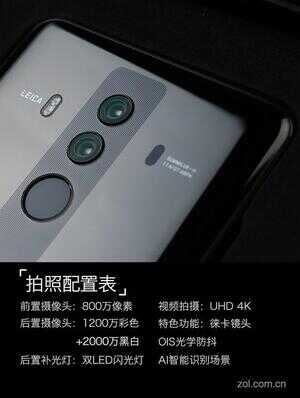 我们先来看看HUAWEI Mate 10 保时捷设计的镜头参数,后置摄像头继续和徕卡合作,采用了新一代徕卡镜头,光圈达到了史无前例的f/1.6的大小,这已经是目前最大的手机镜头光圈了。相机右侧的小字SUMMILUX-H也暗示着这一代徕卡双摄提升必然不俗,后置1200万彩色加2000万黑白的搭配也是华为手机常见的双摄搭配方案。
