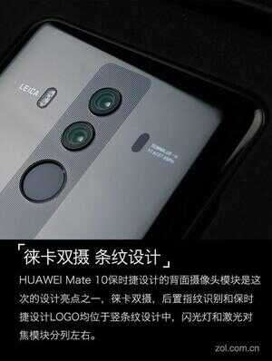 Mate10 保时捷版的整机对称性非常强,无论是上下边框的长度亦或是机身背部各个元件的位置排布都可以看出华为在设计这款手机的外观是下了不少的功夫。Mate 10丨Pro上采用的双拼色设计并没有出现在HUAWEI Mate 10 保时捷设计身上,取而代之的是一条竖置的带状条纹将后置指纹、双摄模块以及经典的保时捷设计LOGO联系在了一起。整机质感尊贵大气,而Mate系列首次采用的玻璃后盖又使其更添了几分雅致和深邃。