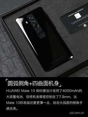 HUAWEI Mate 10 保时捷设计采用了4000mAh的大容量电视,但是也将机身厚度控制在了7.9mm,配合154.2*74.5mm的长宽比例和圆润倒角以及四曲面机身的设计,Mate10 保时捷版的手感非常不错。