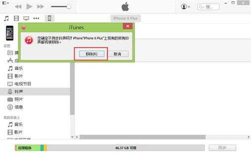 这时,系统会弹出一个提示窗口,询问是否确定不再同步铃声?选择移除的话,将会把iPhone上的所有铃声都移除出去,直接点击下方的移除按钮即可