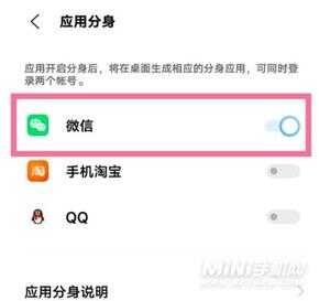 3、将需要开启应用分身的软件后面的按钮开启即可。