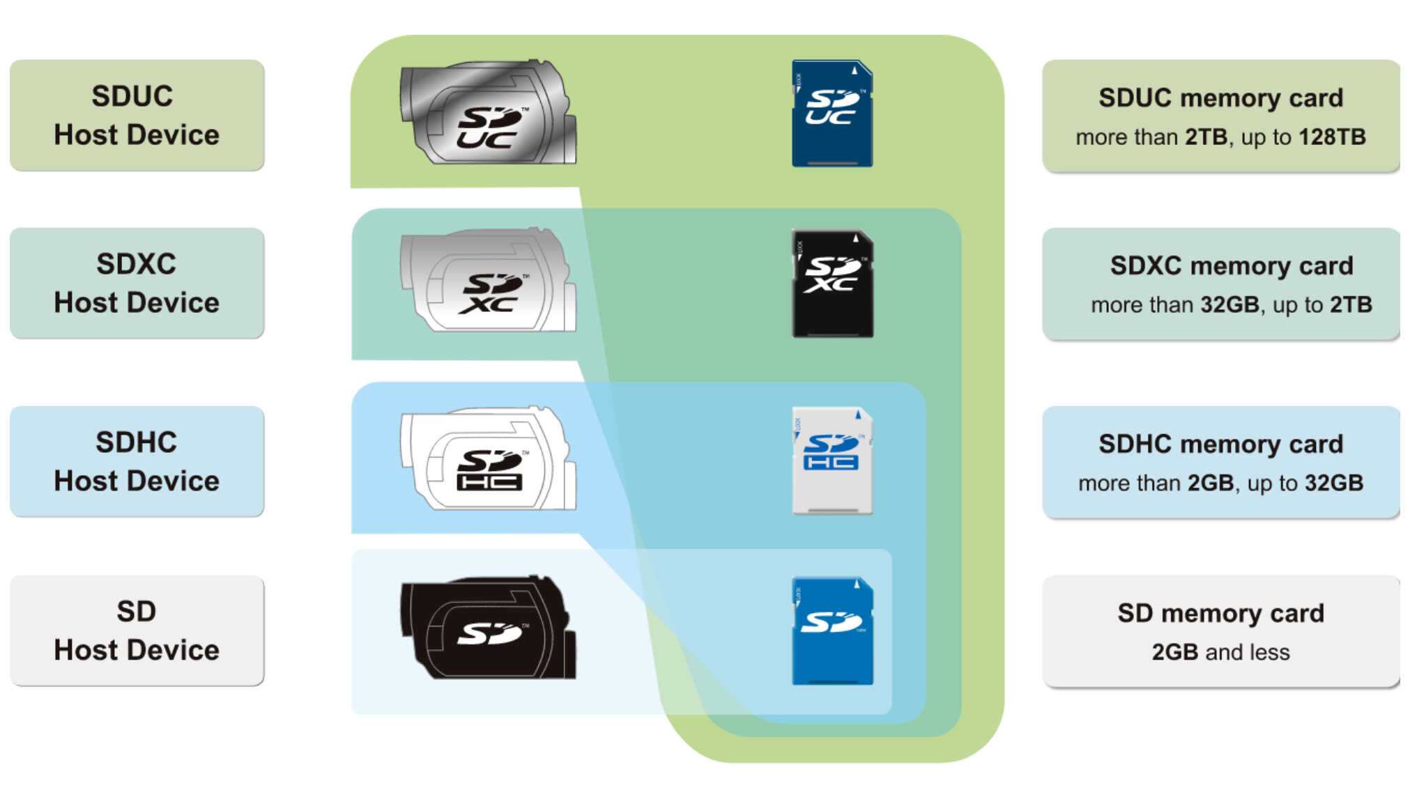 ▲首先SD卡的类型是按照其储存容量来分的,2GB以下叫做SD卡,现在基本上已经淘汰了,现在市面上的基本上是SDXC卡(32GB及以上)以及少量的SDHC卡(2GB至32GB),还有暂时还只停留在标准制定上,并没有真正投产的SDUC标准(2TB-128TB)。对应的手机内存卡则在前面加上micro即可。