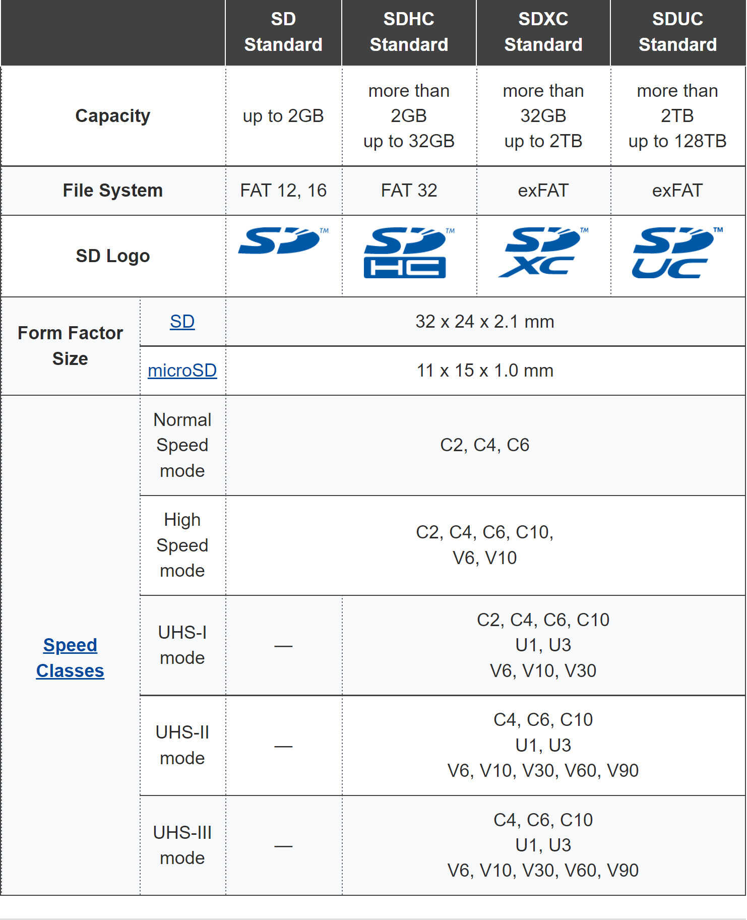 ▲另外,不同的记忆卡类型所使用的总线频率也不同,大家可以看这张图。从SDHC开始,就已经支持UHS-Ⅰ以及更高级的UHS-Ⅱ,UHS-Ⅲ总线界面了,支持UHS-Ⅲ规范的内存卡速度可达624MB/s,速度已经超过SATA3接口的SSD了,而新发布的,走PCIe总线的SD Express标准,速度最高可达3940MB/s,已经达到M.2 SSD的速度,当然,目前为止别提SD Express标准的卡片,就连UHS-Ⅲ规范都还只存在于理论之中。