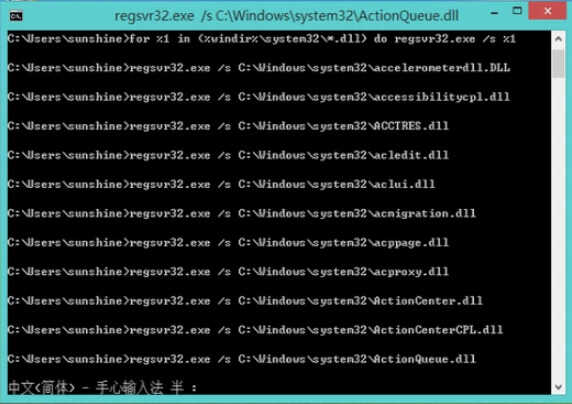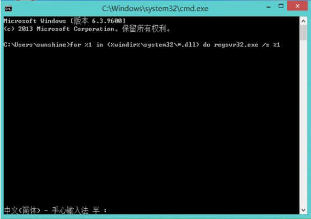 2,在界面输入:for %1 in (%windir%\system32\*.dll) do regsvr32.exe /s %1,并按下回车键。