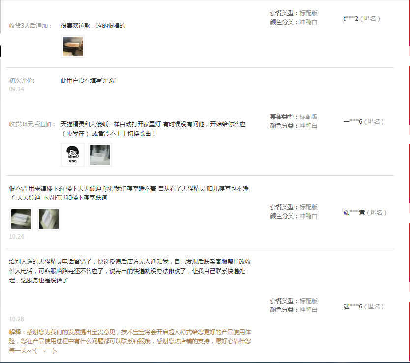 买家秀显示,天猫精灵会识别指令错误,并且好像物流还有问题。综合各大平台上网友真实的声音,除了基本操作之外,小度系列在音质更好、语音互动更人性化、内置资源更丰富等方面稳稳胜出天猫精灵。对于一台智能音箱而言,这三个大的优点几乎涵盖了它该做好的所有事情。