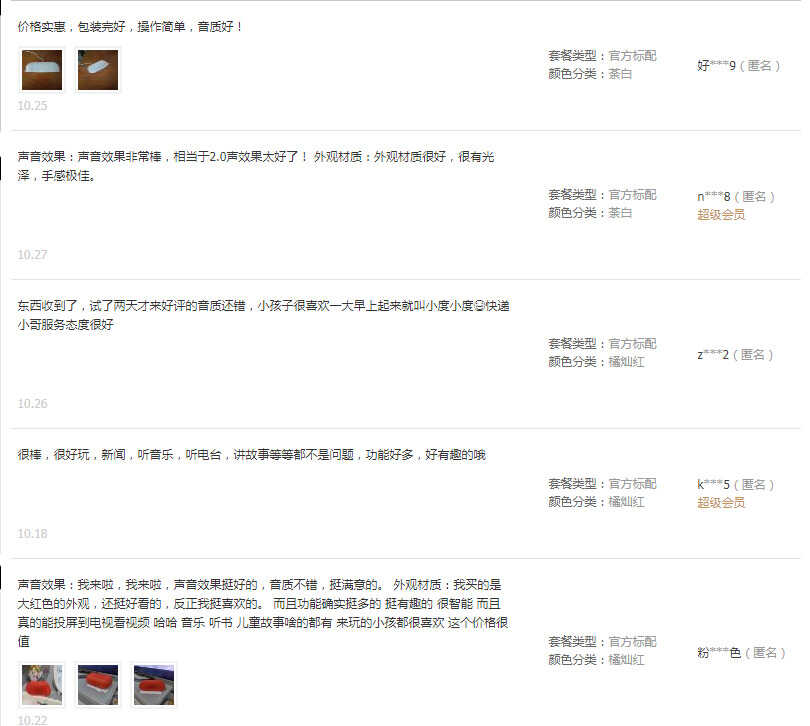 小编已经按捺不住躁动的心要将小度智能音箱加入双十一的购物车了,诶对了,加入购物车之前再看看电商平台上的短评吧,买家秀应该是最真实的了吧!这是小编发稿前仅仅截取的第一页评价,好像就能明显地看出差距哦~
