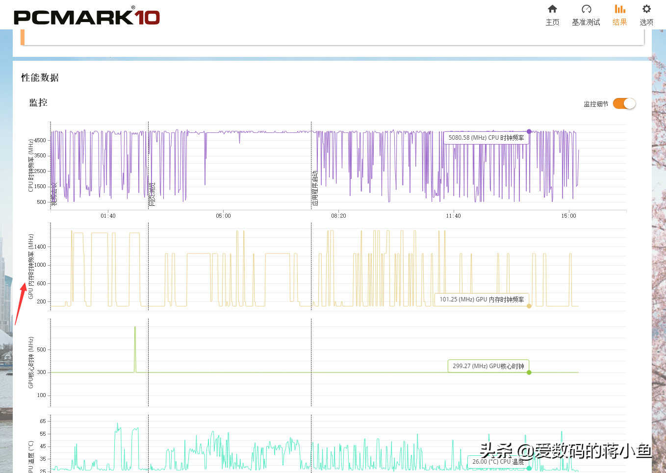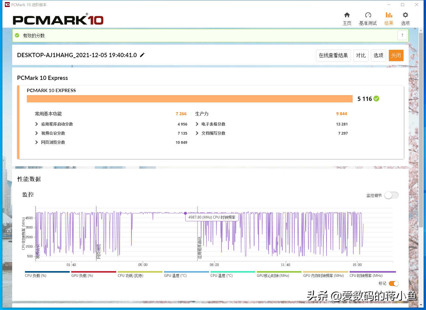 ▼接下来我们用PCMARK10进行跑分测试,测试成绩为5116,在下面可以看到内存时钟频率的变化数值,大家可以作为参考。