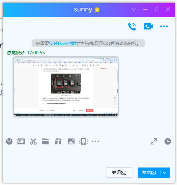 有时,我们不想截取全屏,只想截取某个活动窗口,比方说,我想截取QQ聊天窗口,这时,我们先用鼠标点击QQ聊天窗口,让它变成当前活动窗口,然后同时按下键盘上的 Alt 和 Print Screen键,就可以截取下来保存到剪切板里。然后,按下Ctrl+v键,就可以粘贴到文章编辑器里(如下图)。