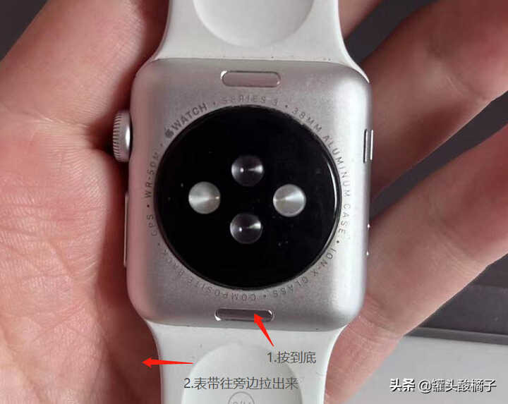 更换表带也非常简单,在表的背面有个金属按钮,按下去后表带从旁边抽出来就好了。
