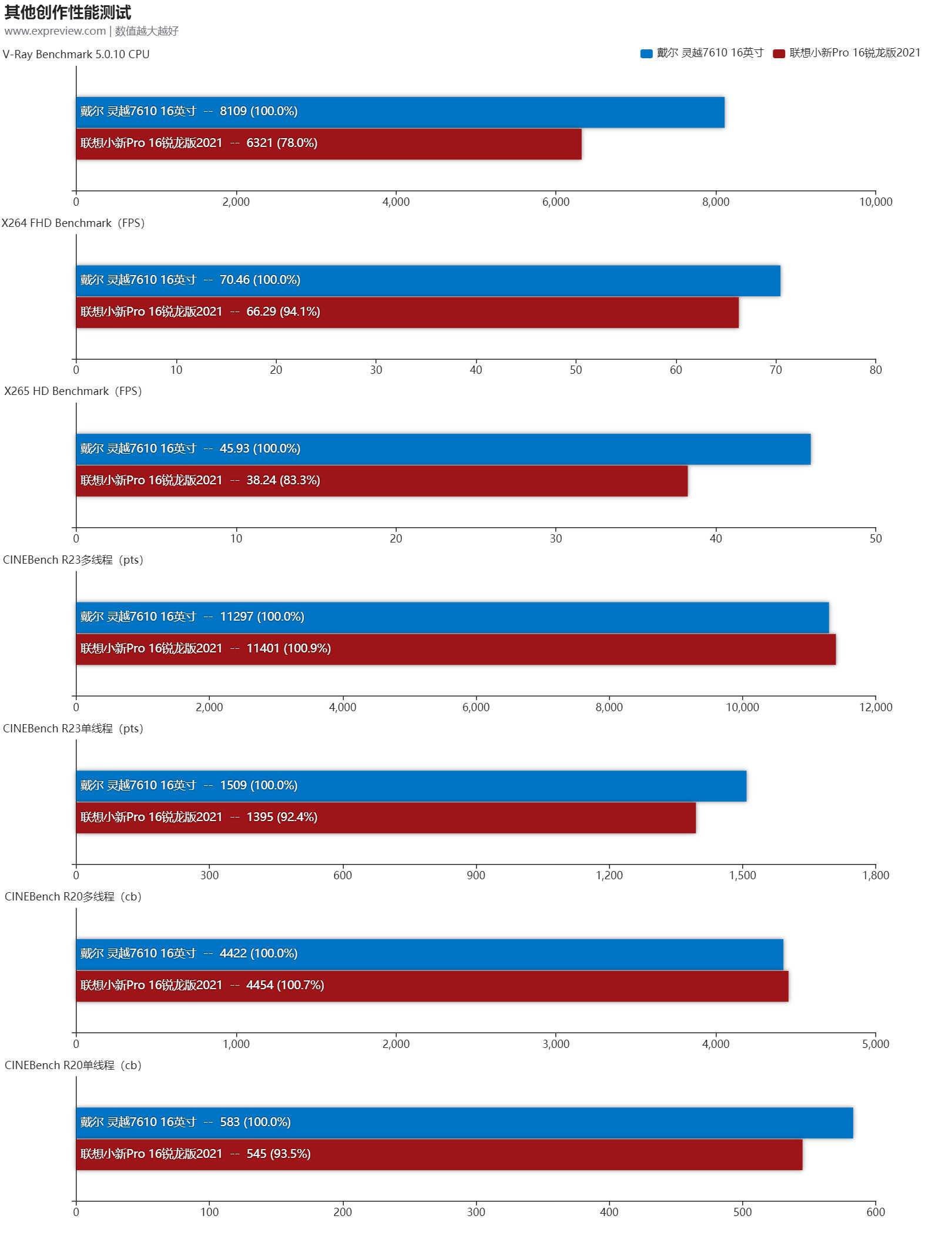 x264以及x265是两个老牌开源编码器,应用相当广泛,在这两个编码器的应用方面,搭载Core i7-11800H的戴尔灵越7610稳压搭载Ryzen 7 5800H的联想小新Pro 16一筹。