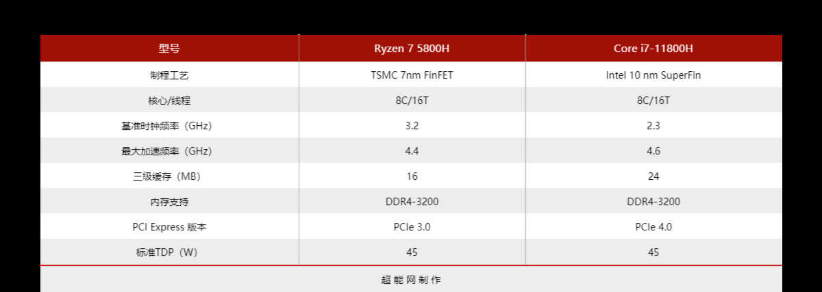 Ryzen 7 5800H和Core i7-11800H的规格对比如下: